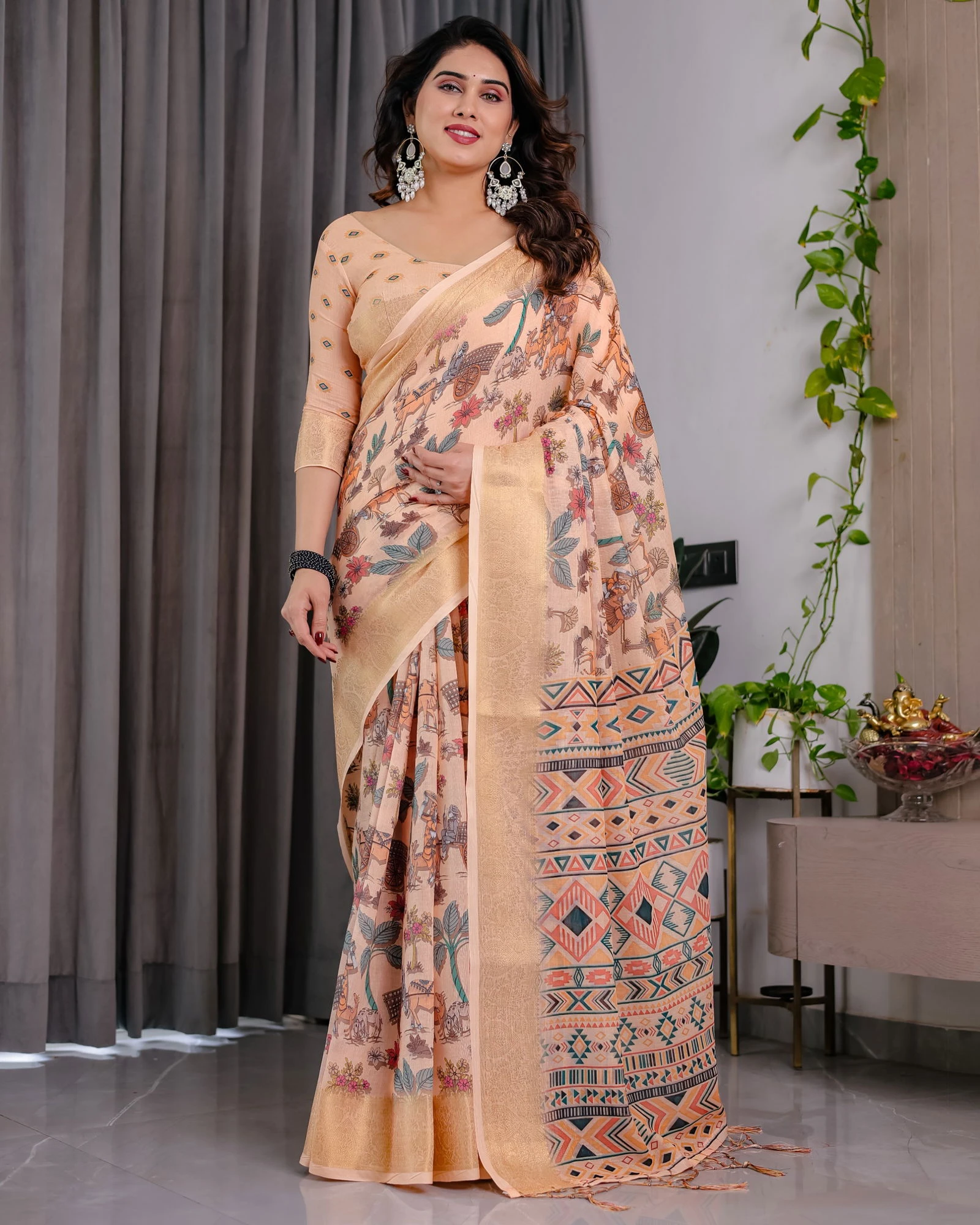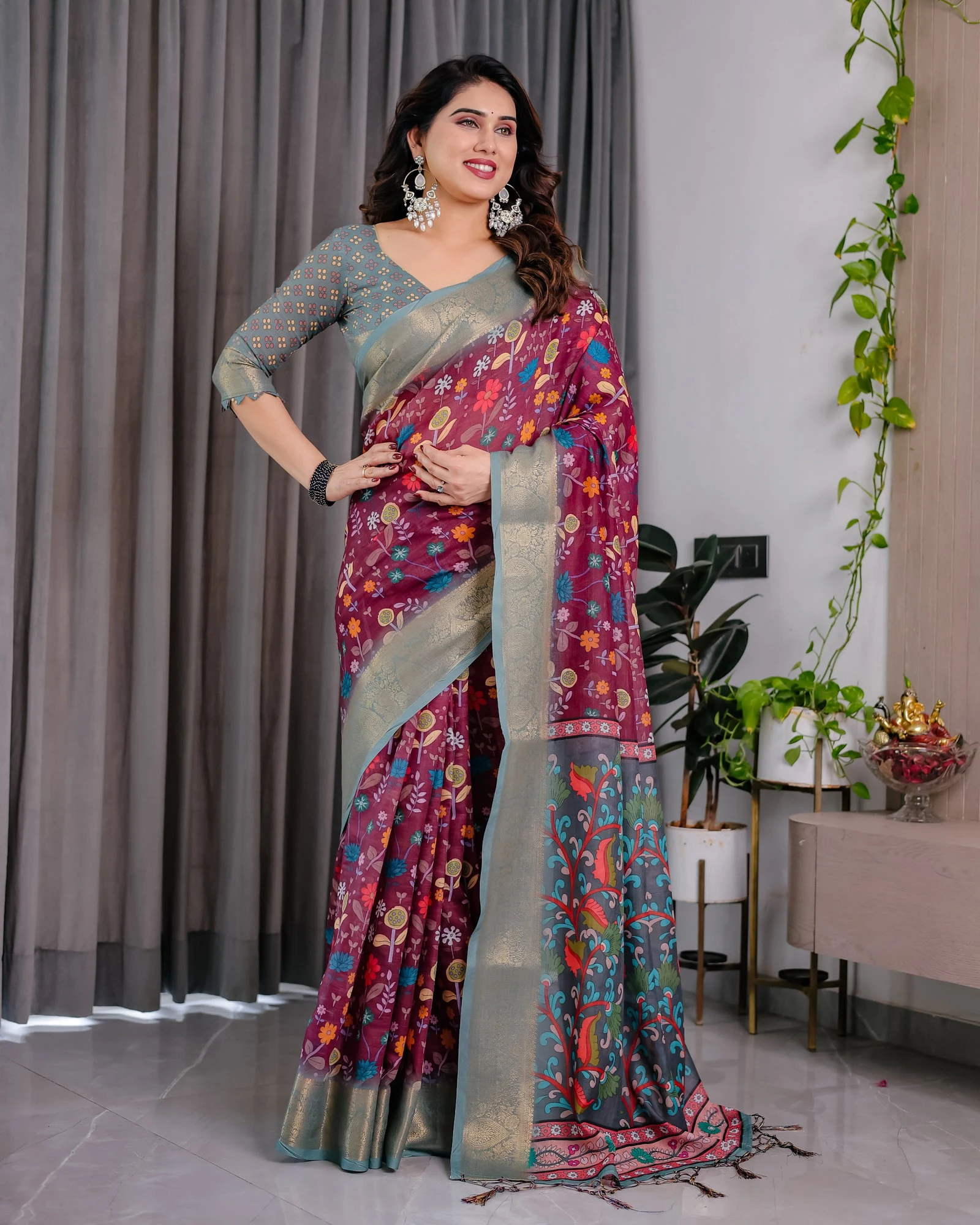 Saree Pure Handloom Linen with Digital Floral Print and Rich Zari Woven Borders
